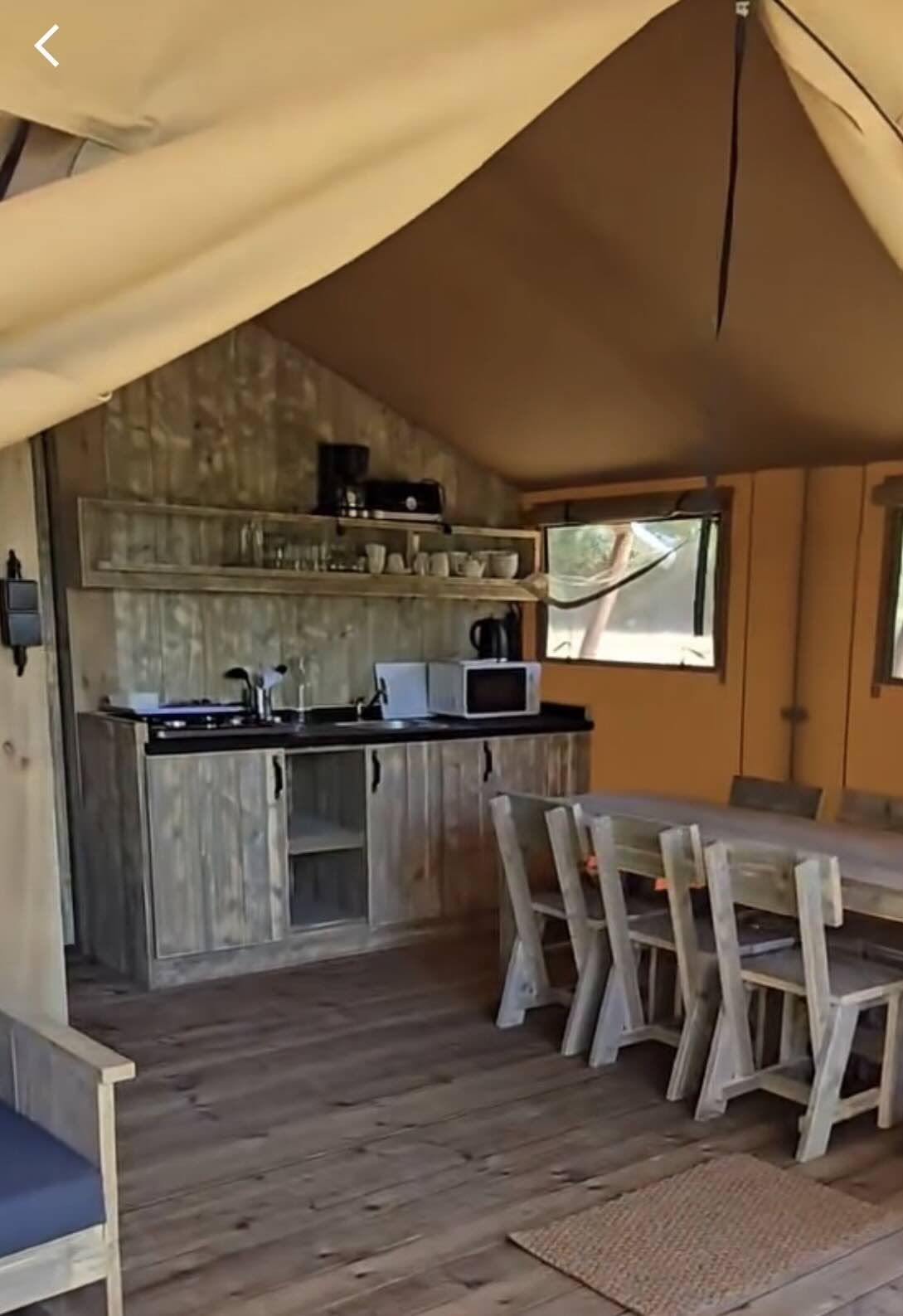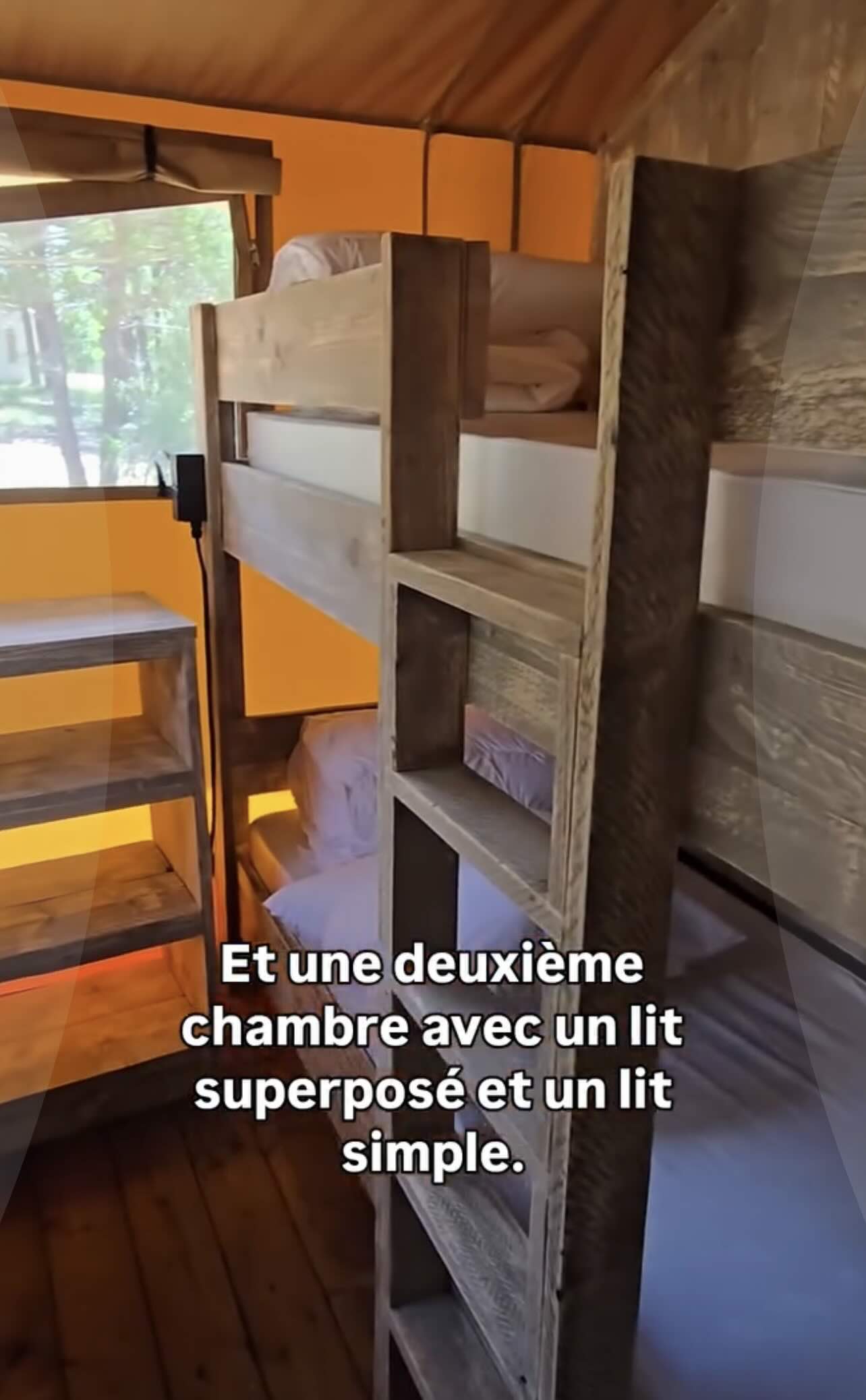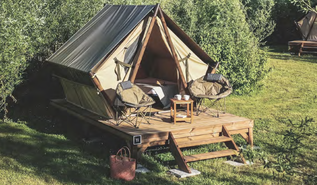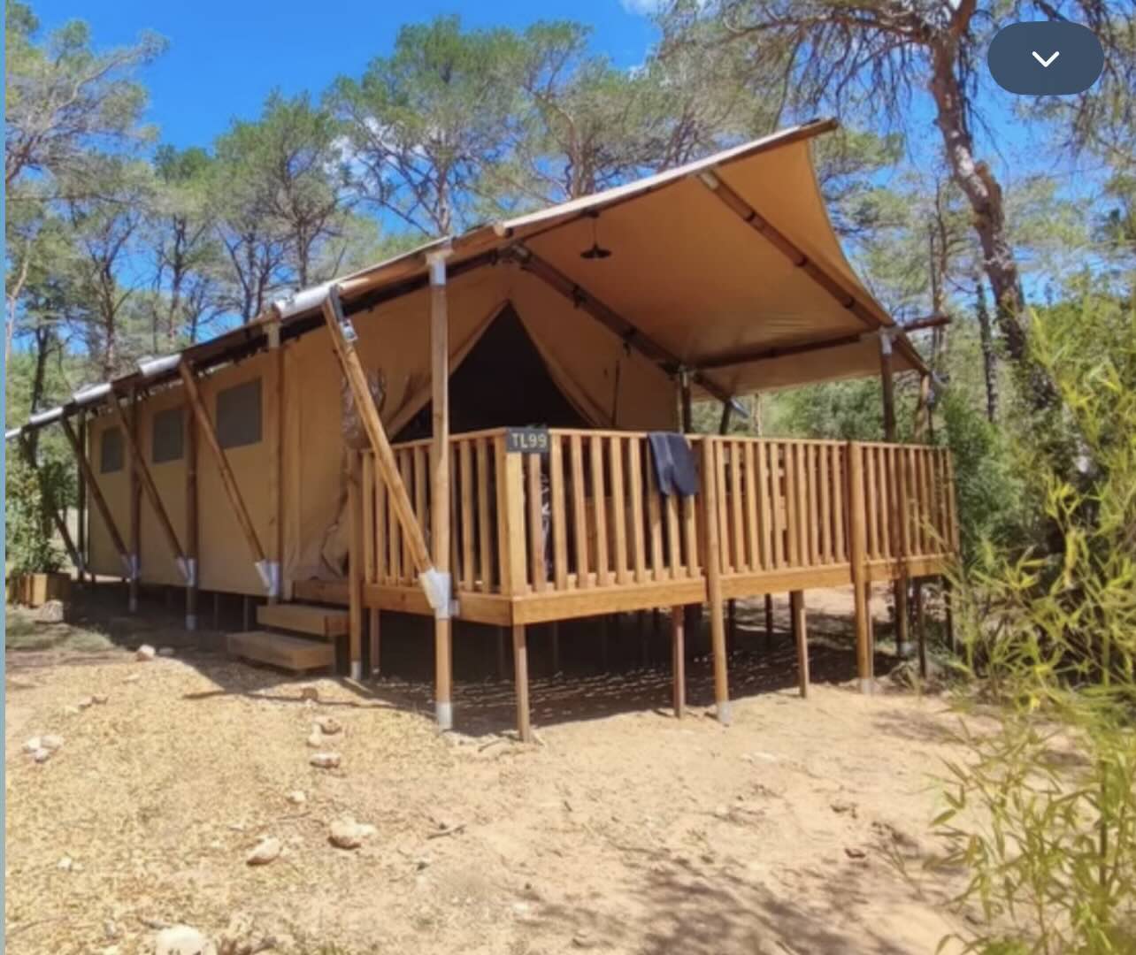 Le glamping, la nouvelle manière de voyager. Venez séjourner au plus près de la nature dans cette grande tente équipée, sur pilotis. Vous disposez de trois chambres, un espace intérieur avec une cuisine tout équipée et un grans salon séjour. Vous disposez d'une grande terrasse avec tout le mobilier extérieur pour profiter des belles soirées d’été.